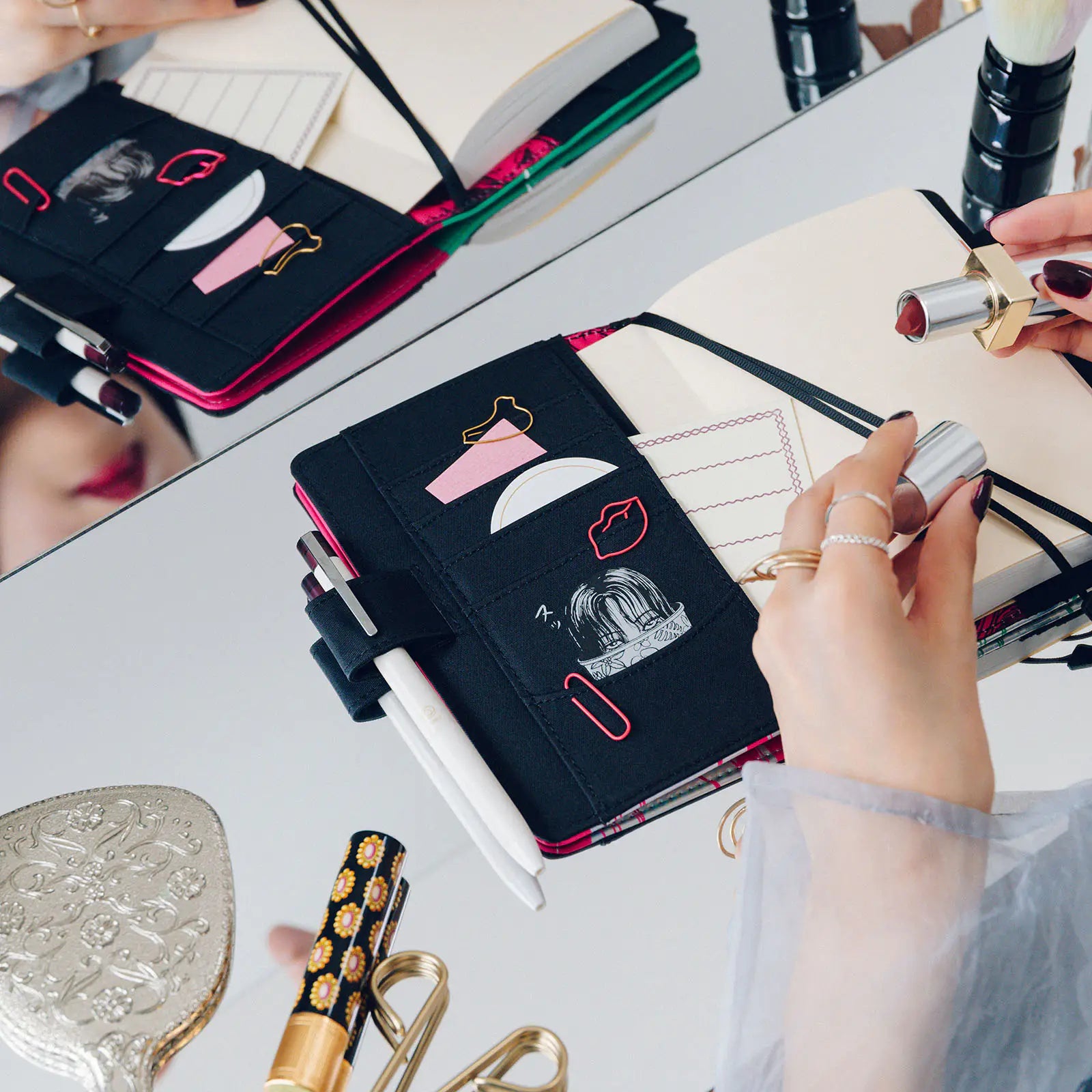 The inside of the cover is black. Hidden in the pocket where the Hobonichi Techo book slips in is a disturbing illustration—a stark contrast to the beautiful Tomie on the front. This scene depicts Tomie, having multiplied into a sake mash, attacking a man while exuding a rich, intoxicating aroma. Though this image is concealed once the techo is inserted, you’ll find madness in every meticulously drawn line.