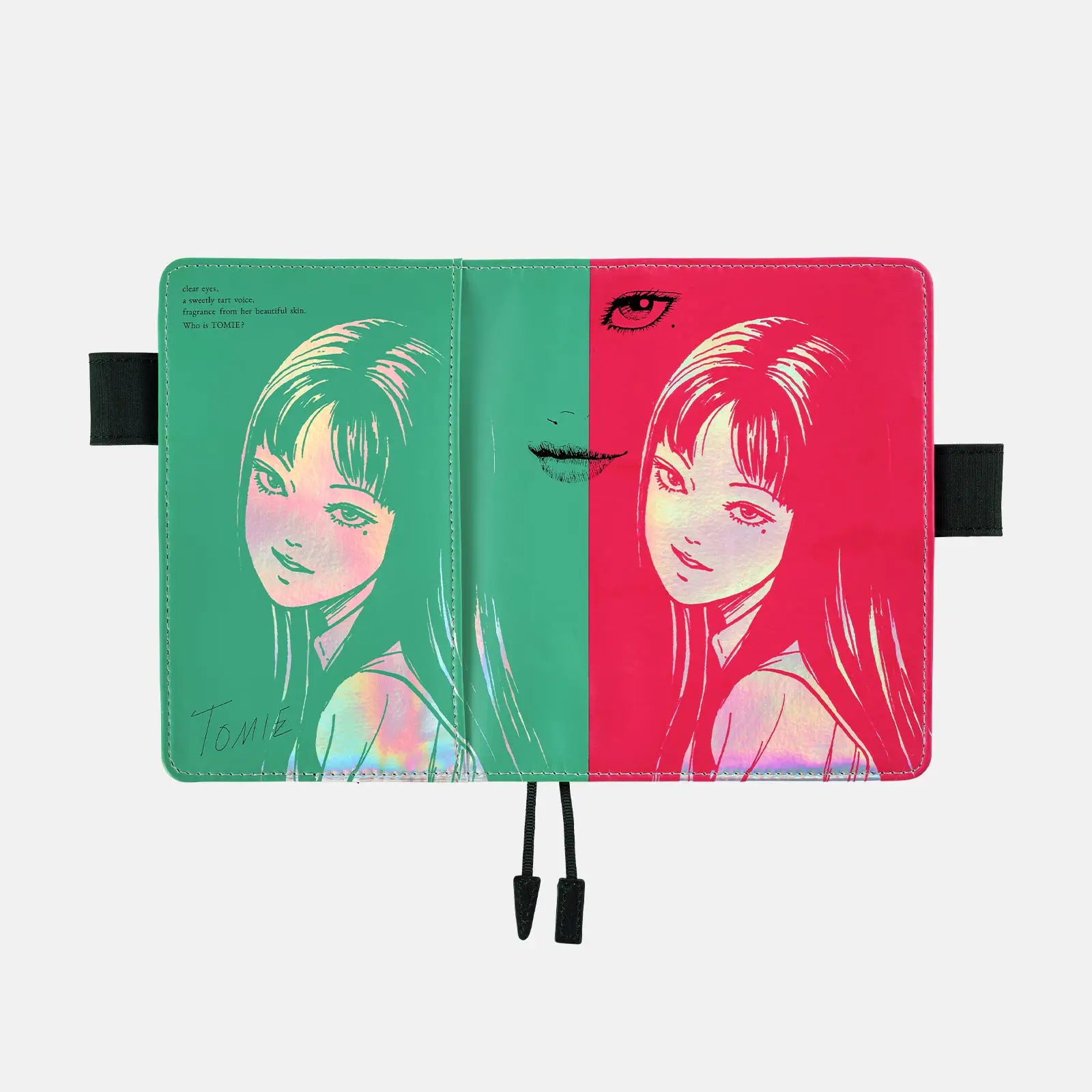 The Tomie Knowing Smile cover for the Original-size techo features luxurious iridescent faux leather, printed with an image of Tomie giving a cold, condescending smile. Her beauty, arrogance, and supernatural ability to return again and again are captured in the shimmering, rainbow-like design of this striking cover.
