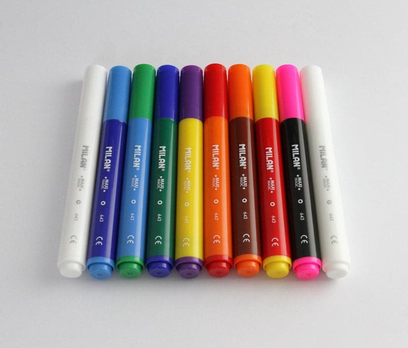 The Maxi Magic fibrepens by Milan are unique and fun. This pack contains 8 coloured fibrepens and 2 ‘magical revealers’. Use the fibrepens to colour, wait 5 seconds and then enjoy changing the colours into new ones with the magic revealers. You can also write secret messages with the magical revealer and simply colour over it with the coloured fibrepens to read the message. The Maxi Magic pens have strong and resistant tips that can be used to create lines from 1mm to 3,25mm thick. The ink used is water-based.