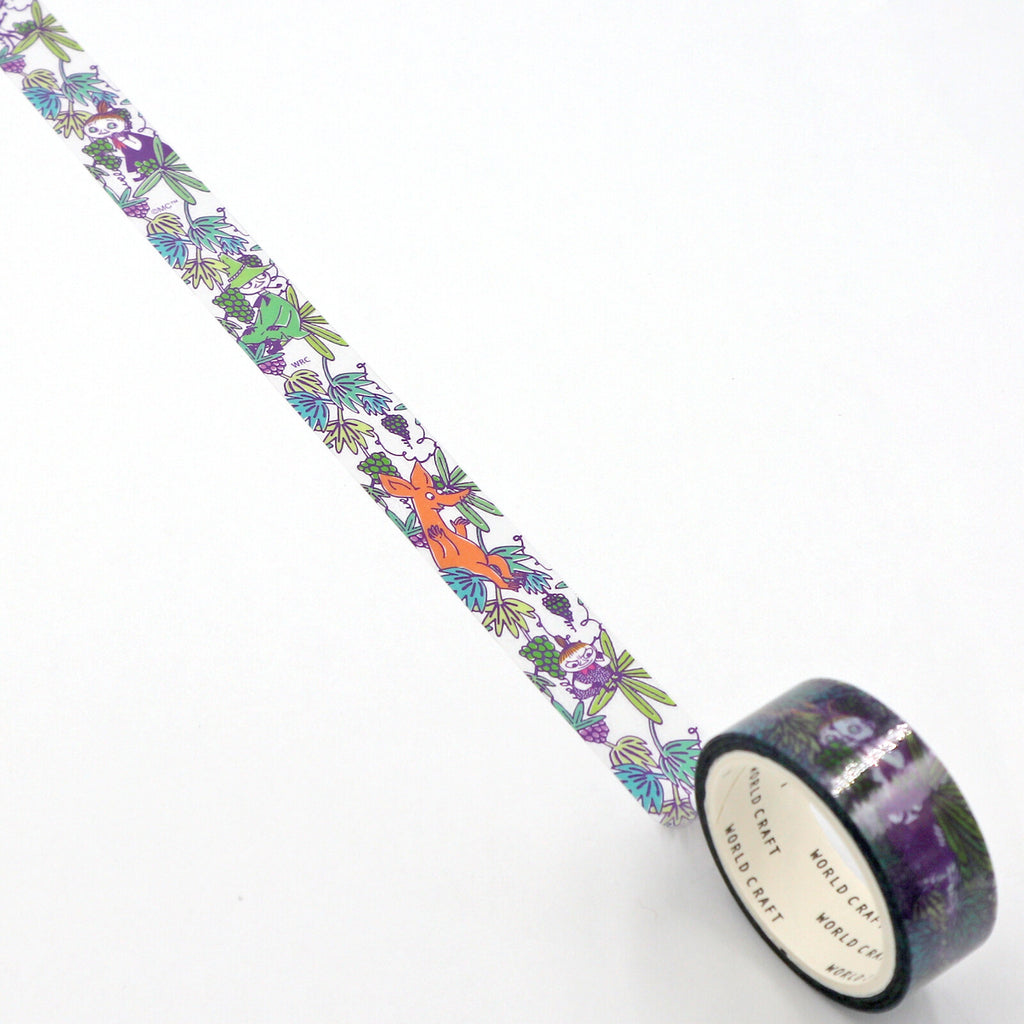 Bring a splash of whimsy to your stationery collection with the Moomin Film Clear Tape in Flower PU by Worldcraft. This unique clear tape features beloved Moomin characters peeking through a vibrant botanical design in rich purples and greens, creating a fun and playful effect along the edges of your stationery and everyday items. Perfect for decorating notebooks, planners, and even bottles or smartphone cases, this tape adds a dash of colour and charm wherever you use it.